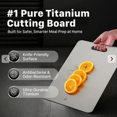 The Katuchef Pure Titanium Cutting Board is a premium kitchen essential designed for those who value hygiene, durability, and modern design. Made from high-quality pure titanium, this cutting board offers exceptional strength and long-lasting performance, far superior to traditional wood or plastic boards. Its non-porous, antibacterial surface helps prevent bacteria buildup, stains, and unpleasant odors, ensuring a safer and cleaner food preparation experience. Unlike conventional cutting boards that absorb moisture and trap germs in deep grooves, the Katuchef cutting board remains smooth, hygienic, and incredibly easy to clean with just water and mild soap. The knife-friendly surface protects your blades from unnecessary wear, helping them stay sharp for longer while resisting scratches and deformation even after frequent use. Featuring a practical double-sided design, the Katuchef Pure Titanium Cutting Board allows you to separate ingredients such as meats, vegetables, and fruits, reducing the risk of cross-contamination and improving kitchen efficiency. Lightweight yet extremely durable, it is ideal for everyday cooking, professional kitchens, outdoor grilling, camping, or even elegant food presentation. Its sleek, modern appearance complements any kitchen style while offering unmatched functionality. Built to withstand years of use without warping, cracking, or absorbing odors, the Katuchef Pure Titanium Cutting Board is a smart investment for anyone seeking a cleaner, safer, and more efficient way to prepare meals, combining innovation, performance, and timeless design in one exceptional kitchen tool.